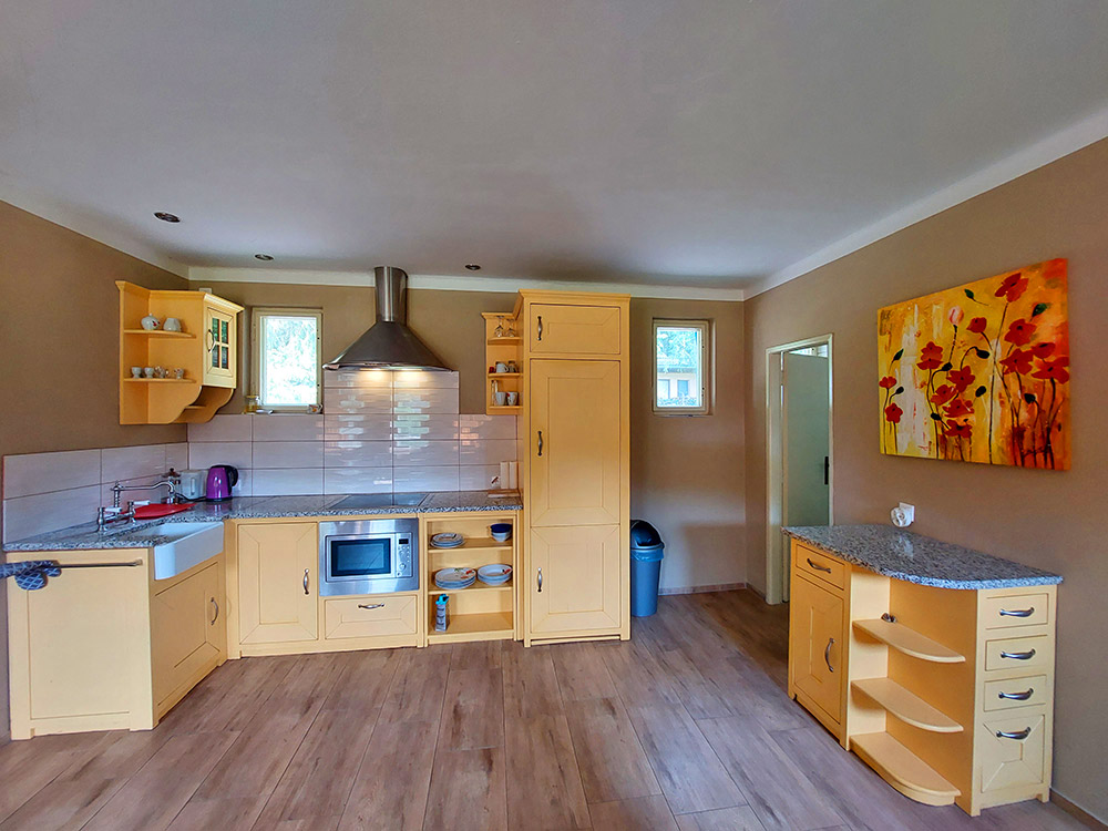 V objektu: vstupní chodba s botníkem a věšákem, společenská místnost (krb, 2x pohovka, konferenční stolek, jídelní stůl, židle, lavice) s kuchyňským koutem (el. sklokeramická deska, vestavěná lednice, mikrovlnná trouba, varná konvice, kávovar), 2/2 ložnice (vždy dvoulůžko), 1/2 + 1 ložnice (patrová postel, kde lze spodní lůžko rozložit na dvoulůžko - přistýlka), koupelna (sprchový kout, umyvadlo, WC). Topení: tuhá paliva - krb.