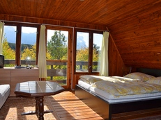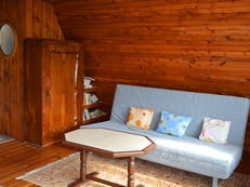 V objektu: 1/4 ložnice, kuchyň (plynový sporák, lednice, kávovar), obývací místnost se 2 lůžky, BVTV, rádio, sedací souprava, krb, koupelna se sprchovým koutem, WC, dřevěné schody do patra (chatařské).