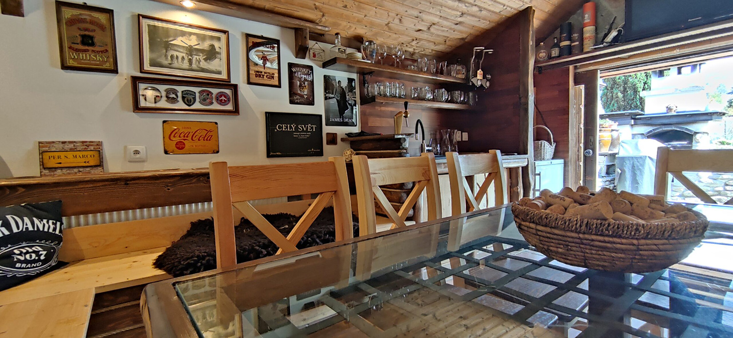 V objektu v přízemí: vstup přes zastřešenou terasu, obývací pokoj (LCDTV + SAT, krbová kamna, sedací souprava, WIFI, DVD přehrávač), kuchyně (el. multifunkční trouba se sklokeramikou deskou, 2x lednička, mikrovlnná trouba, kávovar + presso, rychlovarná konvice), 1x samostatné lůžko, samostatné WC (umyvadlo).