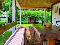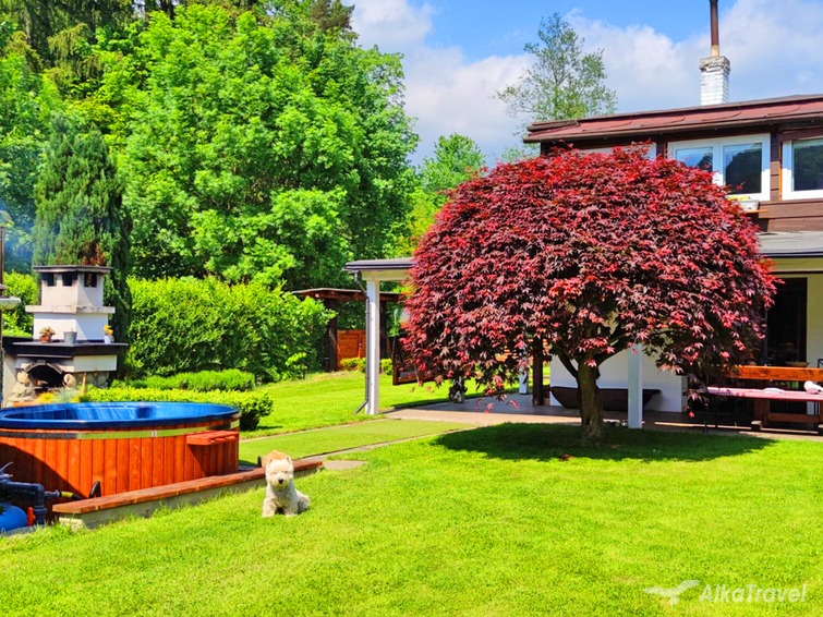 U objektu: oplocená zahrada, terasa, zahradní zastřešené posezení, letní kuchyně s venkovním krbem, plynovým grilem a posezením, zvlášť stojící wellness s vířivkou, saunou a "barem", parkování (5 parkovacích míst).