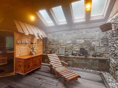 V patře v otevřeném prostoru s odděleným spacím koutem a s koženou sedačkou 1/2 ložnice (LCDTV+SAT, 1x dvoulůžko), 2/2 ložnice (v obou LCDTV+SAT a 1x dvoulůžko), koupelna (vana, umyvadlo, WC). Topení: elektrické, tuhá paliva - krb.