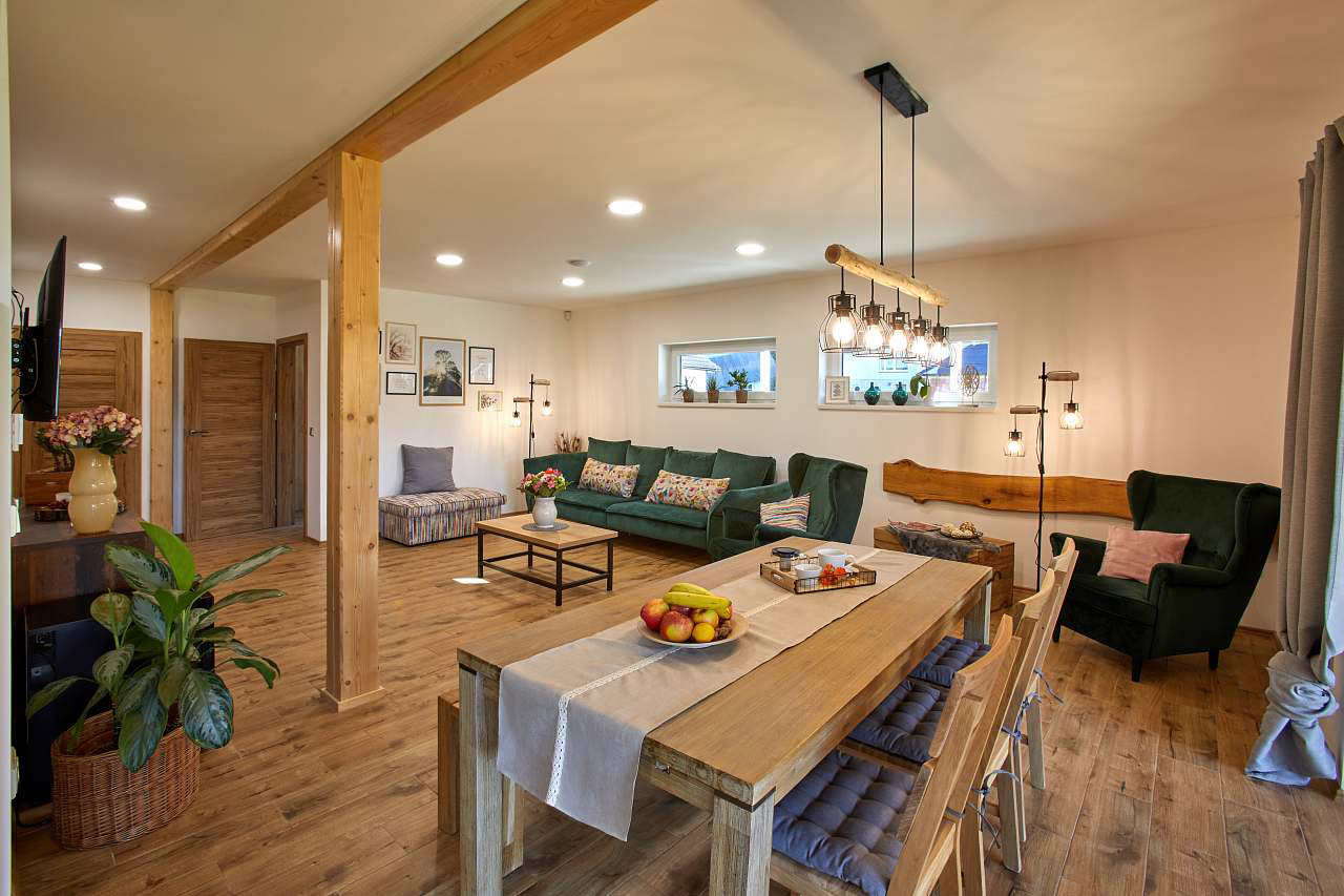 V objektu v přízemí: AP. I. pro 5 osob s vířivkou: samostatný vchod, předsíň s věšákem a botníkem, obývací místnost (LCD TV, sedací souprava, konferenční stolek, křeslo, jídelní stůl + židle, WIFI, výstup na terasu) s kuchyňským koutem (lednice + mrazák, sklokeramická varná deska, elektrická trouba, mikrovlnná trouba, varná konvice, topinkovač, presovač, lednice na víno), 1/2 ložnice (dvoulůžko, skříně), 1/2+1 ložnice (2x samostatné lůžko, 1x přistýlka, skříně), koupelna (sprchový kout, umyvadlo, WC, fén), terasa s posezením, stolem a vířivkou. Apartmán objednávejte v tabulce pod kapacitou 5 osob.
