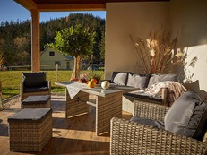 AP. III. pro 6 osob: samostatný vchod (dostupný po venkovních schodech), předsíň s věšákem a botníkem, obývací místnost (LCD TV, sedací souprava, konferenční stolek, jídelní stůl + židle, WIFI) s kuchyňským koutem (lednice + mrazák, sklokeramická varná deska, elektrická trouba, mikrovlnná trouba, varná konvice, topinkovač), 1/2 ložnice (dvoulůžko, skříně), 1/2+2 ložnice (2x samostatné lůžko, 2x přistýlka, skříně), koupelna (sprchový kout, umyvadlo, WC, fén), terasa s posezením (sdílená s vedlejším apartmánem pro 2 osoby).