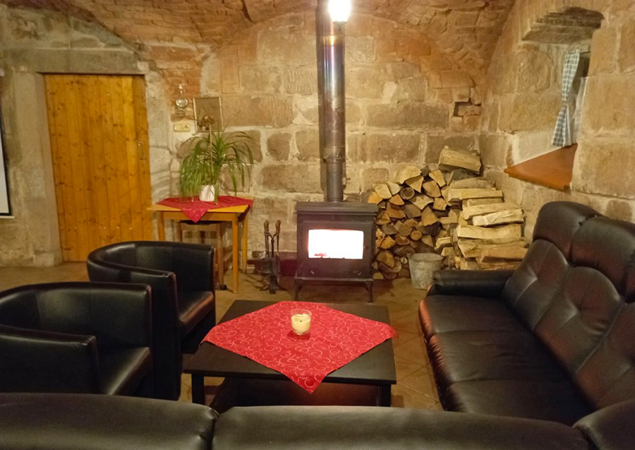 V objektu v patře: Horní apartmán (5 osob): kuchyňský kout (sklokeramická deska, elektrická trouba, lednice, mikrovlnná trouba, varná konvice, TV, stůl + židle), dvoulůžko, samostatné lůžko, patrová postel, koupelna (sprchový kout, umyvadlo, WC). Topení: automatický kotel na tuhá paliva - topí majitel. K dispozici dětská postýlka.