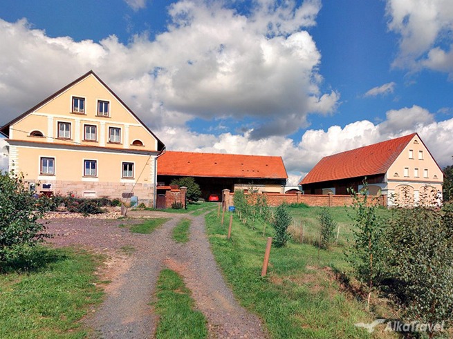 BROUMOVSKO: velká rekreační chalupa/statek v částečně oplocené zahradě s WIFI, SAUNOU, VÍŘIVKOU, BAREM (výčep), venkovním nadzemním BAZÉNEM, trampolínou, pískovištěm, stolní tenisem či udírnou, v obci s výhledem do okolí, nedaleko Broumovských stěn, cca 5 km od centra Broumova.