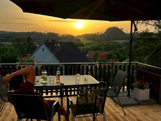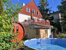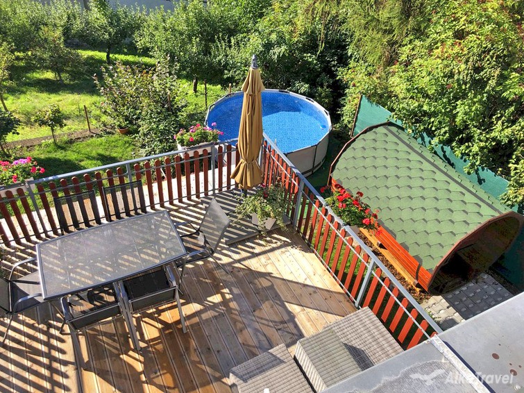 U objektu oplocená zahrada, terasa s výhledem, posezením, slunečníkem a stolem, srubová venkovní sauna, nadzemní bazén, lehátka, zastřešený altán s posezením, stolem a houpačkou, plynový/klasický gril.