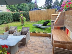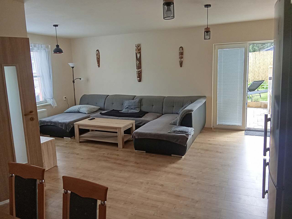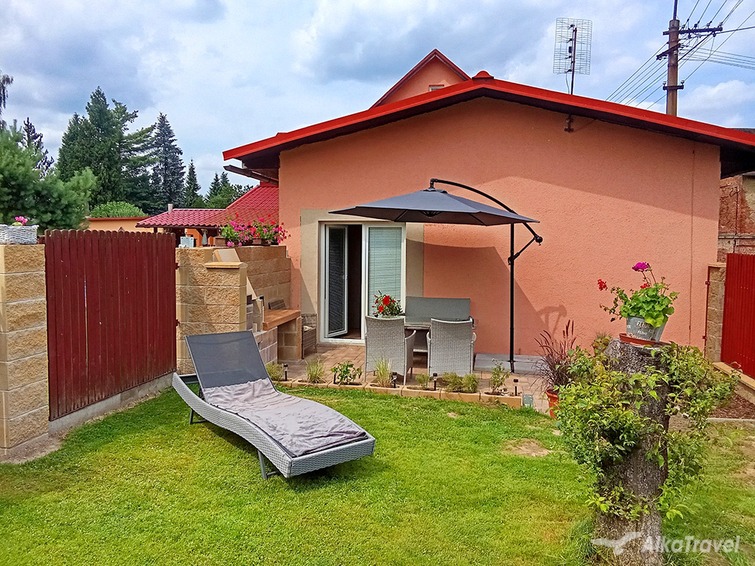 V bungalowu: předsíň, společensk místnost propojená s kuchyní (kuchyňská linka, varná deska, mikrovlnka, varná konvice, trouba, fritéza, veškeré nádobí, lednice s mrazákem), 1x čtyřlůžková ložnice (manželská postel, palanda), z obývacího pokoje se dostanete na zahradu s terasou, koupelna (sprchový kout, umyvadlo, WC). Pozemek je oplocen, parkování u domu, příjezd k domu po asfaltové cestě. Topení: Ústřední topení - elektřina. Domek/bungalow je to řadový, jednopodlažní.