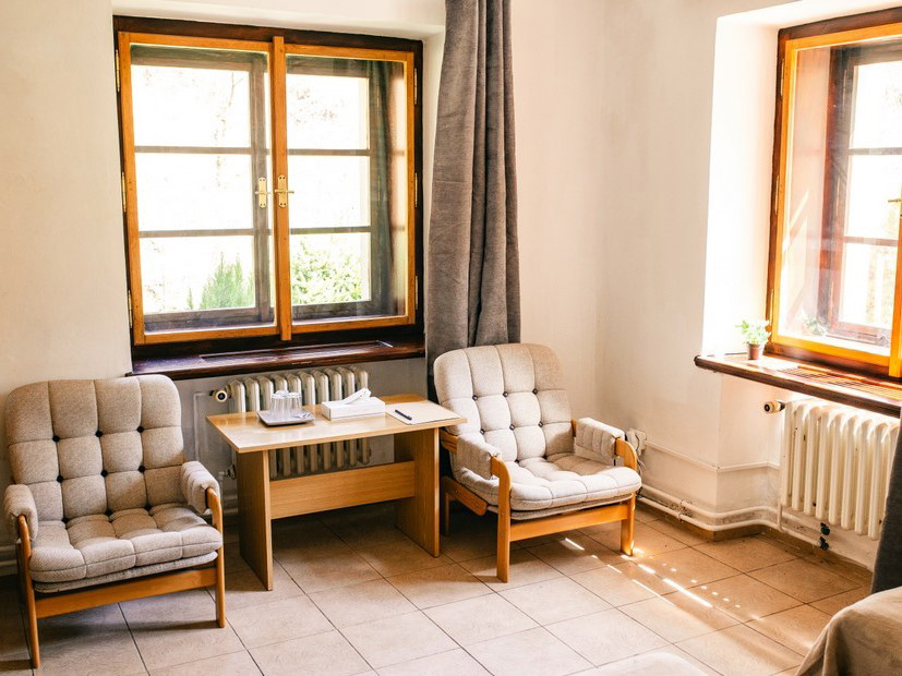 V chalupě: společenská místnost (TV, posezení), 10x ložnice (9x dvoulůžková a 1x šestilůžková - každá ložnice m ávlastní sociální zařízení s WC, sprchou u umyvadlem), kuchyně (2x elektrický vařič, lednice s mrazákem, rychlovarná konvice atd.).
