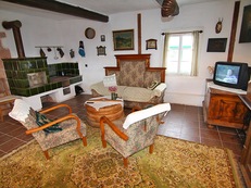 V objektu venkovní zastřešená terasa s posezením, prostorná vstupní chodba s posezením, společenská místnost (kachlová kamna, BVTV, posezení - historická pohovka, 2x křesílko a stolek, 2x lůžko), kuchyň (plně vybavený kuchyňský příborník, kachlová kamna, el. sporák, mikrovlnná trouba, varná konvice, trouba, lednice, jídelní stůl, židle), 1/2 ložnice (1x dvoulůžko, komoda, noční stolky, skříně), koupelna (umyvadlo, sprchový kout), samostatné WC. Topení: tuhá paliva, přímotop - ložnice. POZOR: objekt je striktně nekuřácký.