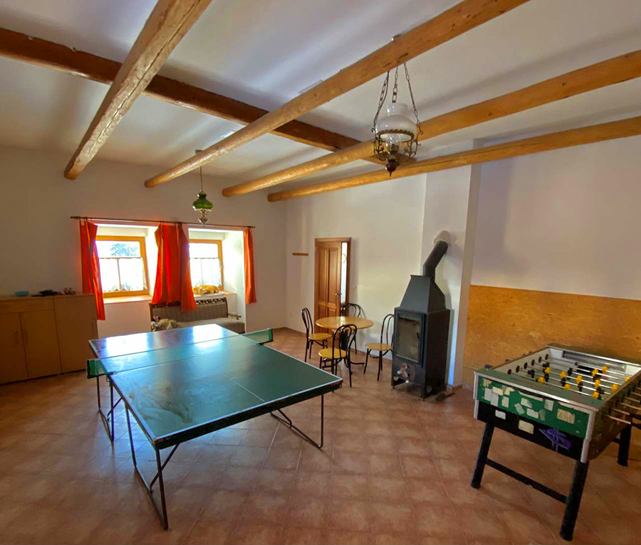 V objektu v přízemí: společenská místnost (TV+SAT, krb, jídelní stůl, židle, pohovka, křesla, konferenční stolek, kulečník), kuchyně (el. sporák, el. trouba, 2x lednice s mrazákem, mikrovlnná trouba, varná konvice, myčka nádobí, kávovar - Nespresso na kapsle, jídelní stůl, židle), herna (stolní tenis, fotbálek, el šipky, krb s rozvodem do celé chalupy, stolek, židle, pohovka), koupelna (sprchový kout, umyvadlo WC), sauna, vířivka.