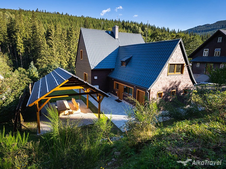 JESENÍKY: zrekonstruovaný rekreační dům v srdcí Jeseníků s VENKOVNÍM KRYTÝM POSEZENÍM, krbová KAMNA a WiFi internetem, 5 km od lázní Karlova Studánka a 8 km od Vrbna pod Pradědem.