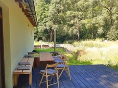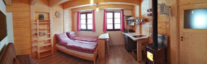 Apartmán I. pro 3 osoby: vstup přes verandu s posezením, společenská místnost (TV, rozkládací pohovka – přistýlka, WIFI, krb, dvoulůžko, společenské hry) s kuchyňským koutem (el. dvouplotýnka, lednice 2x, varná konvice, mikrovlnná trouba, pult s barovou židlí, kontaktním gril, toustovač), koupelna (parní box, umyvadlo, WC, infrasauna).