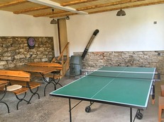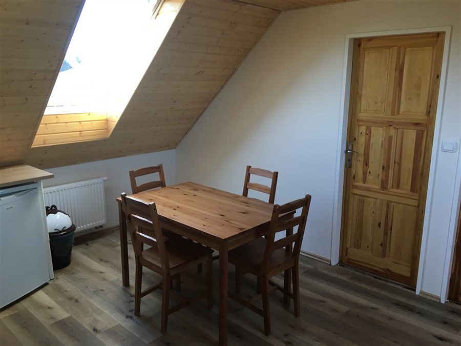V apartmánu: vstup (věšáková stěna se zrcadlem, botník), koupelna (vana se sprchou, umyvadlo, WC, žebřinový radiátor), kuchyně s jídelnou (stůl, židle, sporák s troubou, lednice, mikrovlnná trouba, rychlovarná konvice), 1. ložnice (1x manželská postel, 2 přistýlky, TV), 2. ložnice (2 jednolůžkové postele, TV). Společenská místnost se stolním tenisem, posezením a dvorkem (krb, kryté posezení). Topení: ústřední etážové.
