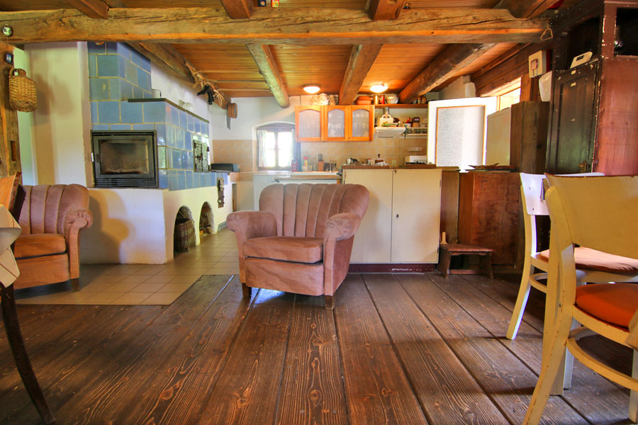 V objektu v přízemí: obývací místnost (TV + SAT, kachlová kamna, sedací souprava - možnost 1x přistýlky, rádio), kuchyně (el. sporák, samostatná trouba, lednice + mrazák, mikrovlnná trouba, varná konvice, kávovar) s jídelnou (3x stůl, židle, lavice), 1/4 ložnice (1x dvojlůžko, 1x palanda), 1/2 ložnice, koupelna (vana, umyvadlo, WC, sauna), samostatné WC s pračkou.