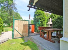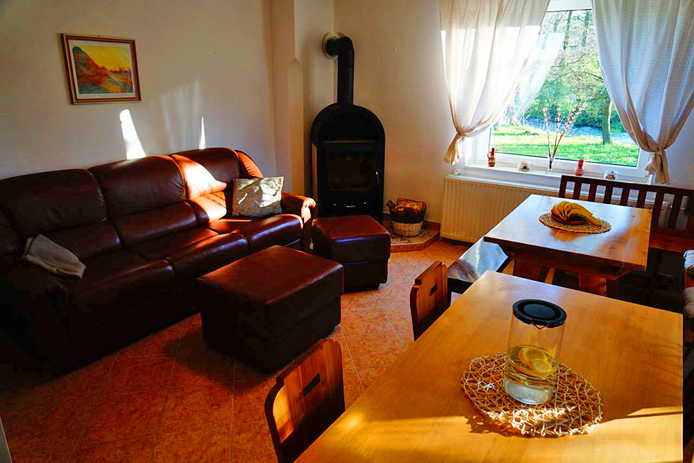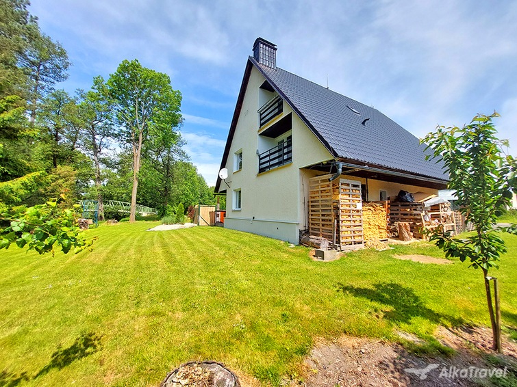 U objektu: neoplocená zahrada, koupací sud, ohniště, gril, terasa, posezení, houpačka, garáž (lyže, kola), řeka, parkování pro 4 auta.