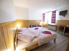 Pokoje: 3x dvoulůžkový pooj, 3x třílůžkový pokoj, 5x rodinný pokoj (1. jedna ložnice se 2 lůžky, druhá ložnice se třemi lůžky, venkovní terasa a jednodušší kuchyňský kout | 2. 2 dvoulůžkové ložnice) | 3. 1 dvoulůžková a 1 třílůžková ložnice, jednodušší kuchyňský kout | 4. 2 dvoulůžkové lonice | 5. 1 dvoulůžková a jedna třílůžková ložnice), pokoj s extra ložnicí (1x dvoulůžková ložnice, kuchyňský kout a rozkládací gauč pro 2 osoby). Sociální zařízení: všechny pokoje mají vlastní WC a koupelnu se sprchovým koutem a umyvadlem. Možnost uložení kol a lyží. Topení: plynový kotel a kotel na tuhá paliva. Parkování: u domu.