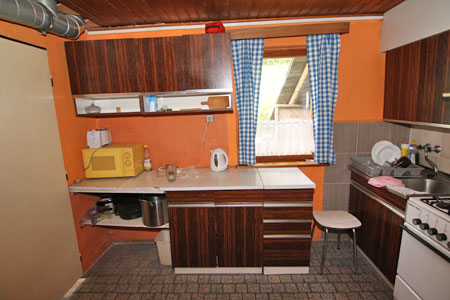 V objektu v přízemí: vstupní chodbička, kuchyně s jídelním koutem (plně vybavená kuchyňská linka, plynový sporák, mikrovlnná trouba, varná konvice, lednice, jídelní stůl, židle, rohová lavice), obývací pokoj s možností přistýlky (BVTV s CZ programy, křesílka, stolek, pohovka, rozkládací gauč, krbová kamna), 1/2 ložnice (2x samostatné lůžko), samostatné WC s umyvadlem.
