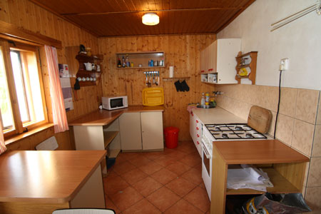 V pravé části objektu v přízemí novější část: vstup, velká společenská místnost s prostorným kuchyňským a jídelním koutem (BVTV - CZ programy, vybavená kuchyňská linka, plynový sporák, krbová kamna k vytápění celého domu, mikrovlnná trouba, varná konvice, lednice, jídelní stůl, rohová lavice, židle, křesílka, rozkládací pohovka s možností 2 přistýlek), koupelna (2x umyvadlo, sprchový kout, pračka).