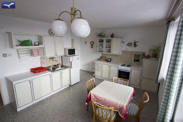 V objektu v přízemí: schody do patra. V objektu v patře: obývací místnost (BVTV, WIFI, skříň, sedací souprava, křesla, stolek), kuchyně (elektrický sporák + trouba, lednice, mikrovlnná trouba, varná konvice) s jídelním koutem (stůl, židle), 1/3 ložnice (dvoulůžko, samostatné lůžko), 1/3 ložnice (dvoulůžko, samostatné lůžko), koupelna (vana, sprchový kout, 2x umyvadlo), samostatné WC. Možnost přidání 2 přistýlek do obývacího pokoje nebo do větší 1/3 ložnice. Topení: ústřední.