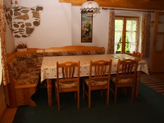 V objektu v přízemí předsíň s úložným prostorem, kuchyň s jídelnou (kuchyňská linka, kombinovaný sporák, mikrovlnná trouba, lednice, varná konvice, dřevěný stůl s rohovou lavicí a židlemi, 1 lůžko), místnost se stolním tenisem a možností uschování vlastních kol, koupelna (sprchový kout, umyvadlo, WC).