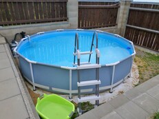U objektu: zatravněná terasovitá a oplocená zahrada, nadzemní bazén (průměr 3,6m, hloubka 1m), venkovní zastřešená terasa s kuchyňkou, grilem a posezením, slunečník, pískoviště, houpačka, trampolína, úschovna kol a lyží, parkování.