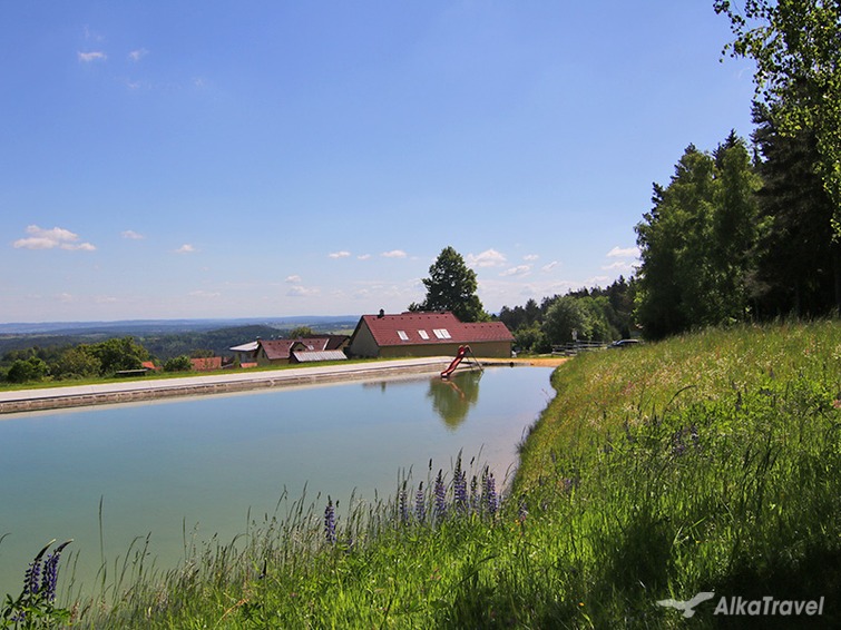 JIŽNÍ ČECHY: patrový rekreační domek s vejminkem na úplném konci obce pod horou Kleť, u lesa a přírodního koupaliště s nádhernou a dalekou vyhlídkou do kraje, s WIFI internetem, trampolínou, houpačkou, bazénem a pískovištěm, 7,5 km od Českého Krumlova - UNESCO, 19 km od Českých Budějovic a 5 km od Zlaté Koruny.