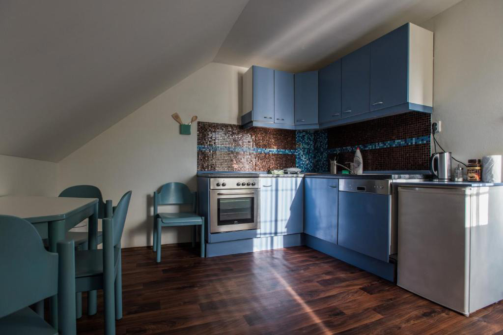 V objektu v přízemí: 4. apartmán - 1x čtyřlůžkový pokoj (2x manželská postel), 1x 2 lůžka (rozkládací gauč), kuchyně (posezení, mikrovlnná trouba, lednice, sporák, rychlovarná konvice). Samostatná část objektu (bez narušení soukromí) je využívána.