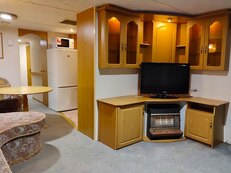 V objektu: průchozí chodbička spojená s kuchyní a obývacím koutem. Kuchyň: lednička s mrazákem, pečící trouba, rychlovarná konvice, plynový sporák, mikrovlnná trouba + jídelní stůl. Obývací část: televize, sedací souprava, stolek. Ložnice: 3/2 ložnice (3x samostatný pokoj s manželskou postelí). Koupelna: WC, umyvadlo, sprchový kout. Před vchodem do objektu: terasa s vyhlídkou, jídelním stolem a židličkami. Na terasu vedou 4 dřevěné schody. Parkování v uzavřeném areálu. Topení: elektrické přímotopy.