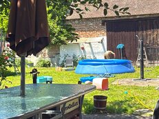 U objektu oplocená zahrada, letní kruhový nadzemní bazén (letní školní prázdniny), krytá pergola s posezením, krbem a letní kuchyňkou, trampolína, parkování.