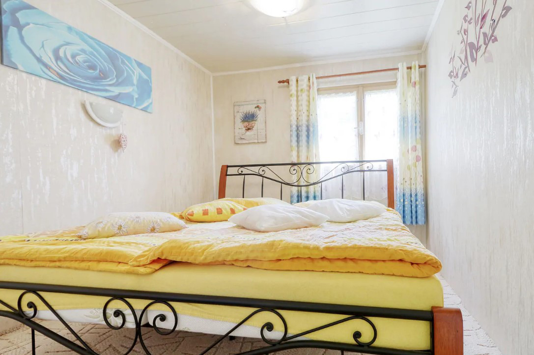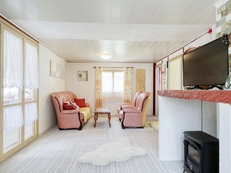 V objektu v patře: vchod, obývací pokoj (krb, posezení, jídelní stůl), kuchyně (myčka nádobí, sporák, trouba, mikrovlnná trouba, varná konvice, toustovač), 1/1 ložnice, 2/2 ložnice (manželská postel, dětská postýlka na vyžádání). Topení: tuhá paliva, elektrické.