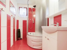 V objektu v přízemí: koupelna (sprchový kout, umyvadlo, WC), terasa s posezením, schody do patra.