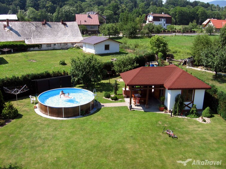 U objektu oplocená zahrada s BAZÉNEM (průměr 5,5 m), venkovním grilem, zahradním posezením a s pergolou. Parkování v zahradě u objektu. V okolí tenisové kurty, lyžařské vleky, koupání, horská turistika, cykloturistika, jízdárna koně, diskotéka, kino. Koupání: 3 km, lyžařský vlek: od 5 km, obchod a restaurace: 500 m, vlak: 500 m, autobus: 300 m.