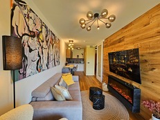 V apartmánu: vstupní chodba, společenská místnost (elektrický krb, posezení, 2 přistýlky, TV) s kuchyňský koutem (myčka nádobí, kávovar, sporák, rychlovarná konvice, lednice, mikrovlnná trouba s mrazící přihrádkou, toustovač, bar s posezením až pro 4 osoby), 1/2 ložnice (dvoulůžko, vstup na balkon), koupelna (žebřík na sušení oblečení, sprchový kout, umyvadlo, WC, pračka a sušička), terasa s posezením. Topení: centrální, domácí zvíře: ANO - malá plemena na dotaz.