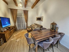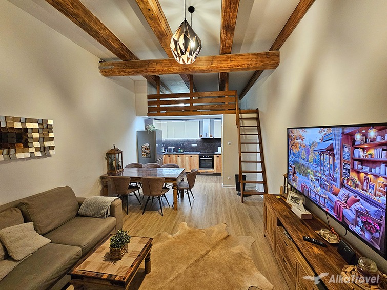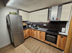 KRKONOŠE: moderní rekreační apartmán s WiFi internetem s PRAČKOU i KÁVOREM na zrnkovou kávu v lyžařském středisku Krkonoše. V apartmánu: společenská místnost s posezením a TV, kouchyňský kout (kávovar na zrnkovou kávu, lednice s mrazákem, myčka nádobí, trouba, sporák, mikrovlnná trouba, rychlovarná konvice), spaní ve zvýšenem patře (4x spaní), samostatná dvoulůžková ložnice (manželská postel, TV) se vstupem na terasu, samostatná dvoulůžková ložnice (patrová postel), vstupní chodba, koupelna (pračka, umyvadlo, sprcha/vana), samostatné WC, terasa s výhledem na potůček a les.