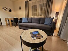 V apartmánu: vstupní chodba, menší místnost s možností uložení lyží, obývací místnost (vstup na terasu), kuchyňský kout (rychlovarná konvice, mikrovlnná trouba, lednice s mrazícím boxem, sporák), TV, posezení s jídelním stolem, rozkládací gauč (možnost 1 přistýlky), 1x čtyřlůžková ložnice (manželská postel, samostatné lůžko a výsuvná postel), skříně, dětská postýlka a židlička. Topení: centrální, domácí zvíře: ne. U objektu: parkování, krytá terasa s posezením a grillem.