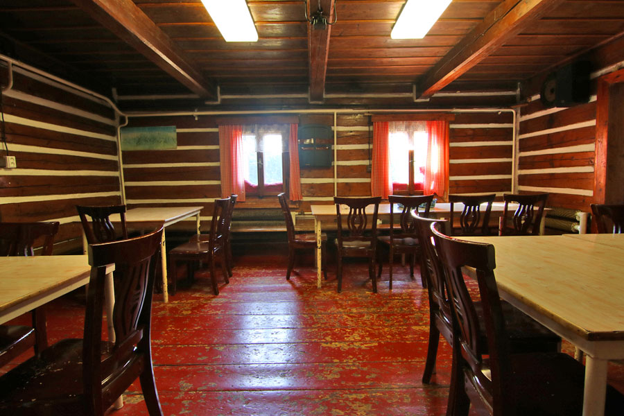 V objektu v přízemí: vstupní chodba, společenská místnost + jídelna (stoly, židle, křesla s výhledem na BVTV "ala kino," krbová kamna), kuchyně (kamna na tuhá paliva, el. dvouvařič, el. trouba, 2x lednice + 2x mrazák, mikrovlnná trouba, el. konvice, 2x spižírna), 1. koupelna (2x sprchový kout, 2x dámské, 2x pánské WC), 2. koupelna (3x umyvadlo, sprchový kout), lyžárna, kulečník, stolní tenis, šipky.