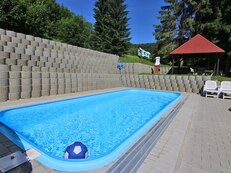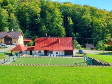 Sportovní multifunkční hřiště a KRYTÝ venkovní ZAPUŠTĚNÝ bazén jen pro ubytované.