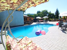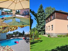 U objektu udržovaná oplocená zahrada se zapuštěným a vyhřívaným bazénem (délka 10 m, šířka 6 m, hloubka 1 až 2m, v provozu cca červen-srpen / pozor, s ohledem na počasí může být začátek posunut, nelze garantovat), vířivou vanou (možnost 3x týdně po dohodě, další případně dle dohody na místě - jen červen až srpen/ pozor s ohledem na počasí může být počátek vířivky i posunut, negarantujeme), zastřešené posezení s plynovým grilem a velkým grilem na dřevěné uhlí, kuchyňkou s možností individuálního vlastního občerstvení (výčepní zařízení, kávovar, lednice), dětské hřiště (skluzavka, trampolína, houpačky, kolotoč, pískoviště), parkování až pro 10 aut, možnost zapůjčení sportovního náčiní za poplatek, cyklistické a turistické stezky přímo od objektu.