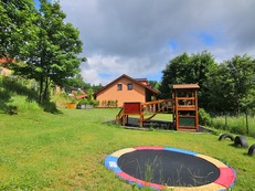 KRUŠNÉ HORY: komfortní rekreační domek s oplocenou zahradou, DĚTSKÝM HŘIŠTĚM, BAZÉNEM a TRAMPOLÍNOU, 2 km od Kraslic a 5 km od hranic s Německem s možností blízkého lyžování.