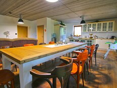 V patře: 3x třílůžkový pokoj (vždy 1x manželská postel a 1x rozkládací lůžko - přistýlka), 1x dvoulůžkový pokoj (1x manželská postel + možná dětská postýlka), 1x koupelna se sprchovým koutem, umyvadlo a WC, 1x samostatné WC a umyvadlo. Topení: tuhá paliva – krb, elektrické přímotopy - topení na el. kotel. Možno nabíjení elektroaut přímo u domu (doporučujeme při objednávce napsat do Poznámky, že máte elektromobil). Tento dům velmi rádi doporučujeme!