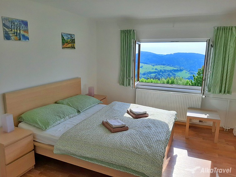 V objektu v patře: prostorné schodiště se zábradlím a bariérou proti pádu dětí, 2/2 lůžkové ložnice (vždy manželská postel a skříň), koupelna (vana, umyvadlo, WC). Topení: centrální elektrické, domácí zvíře: ne.