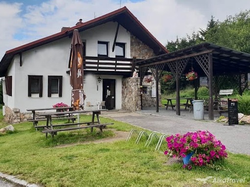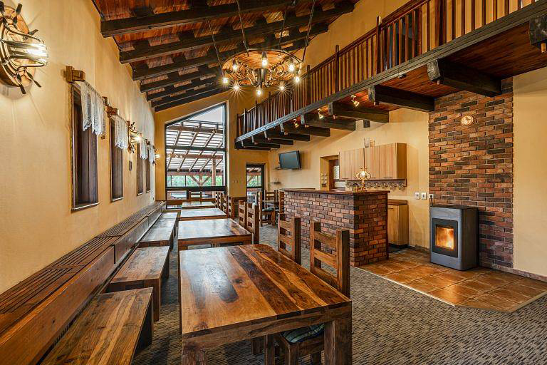 V objektu v přízemí: vstupní chodba, vybavená společenská místnost/hospůdka (posezení, krb) s barem (výčepní zařízení, kávovar, 2x lednice), kuchyň (plynový sporák, trouba, mikrovlnná trouba, gastro myčka), lyžárna (vysoušeč bot), schody do patra.