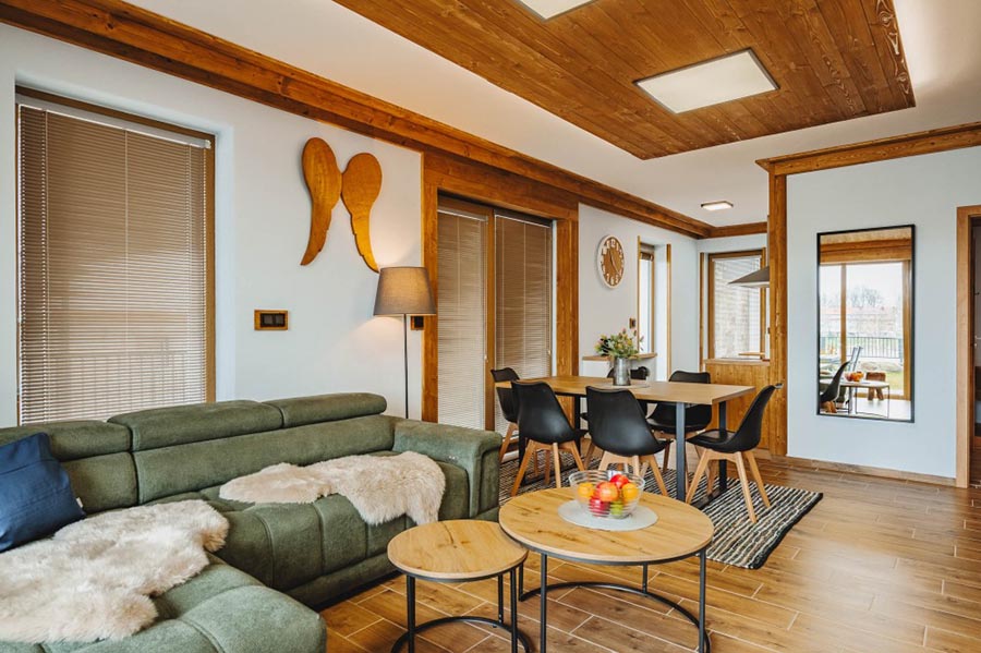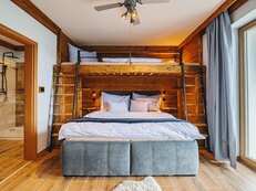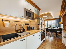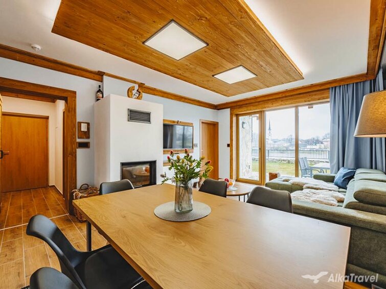 V apartmánu: vstupní chodba (šatní skříně), společenská místnost (TV, pohovka, posezení, výhled na Lipno, výstup na venkovní terasu s posezením a zahradu ze které se dostanete na soukromou pláž), kuchyňský kout (myčka nádobí, kávovar, rychlovarná konvice, toustovač, mikrovlnná trouba, sporák, trouba, lednice s mrazákem), 1/2 ložnice (1x dvoulůžko, TV, koupelna se sprchovým koutem a WC, výstup na terasu s posezením), 1/2+1 ložnice (1x dvoulůžko, 1x patrové lůžko, koupelna se sprchovým koutem a WC, výstup na venkovní terasu s posezením a zahradu ze které se dostanete na soukromou pláž). Topení: centrální. K dispozici: dětská postýlka (150,-Kč/noc), klimatizace.