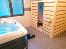 V chalupě: kuchyně (lednice, myčka nádobý, kávovar, varná konvice, trouba, nádobí), jídelna, obývací pokoj (TV, domácí kino, krb), otevřený prostor a posezením, 5 dvoulůžkových a 1 třílůžkový pokoj, možnost dalších 2 přistýlek (matrace na pokojích), koupelna (sprchový kout, WC), koupelna (masážní box), 2x samostatné WC, sauna (finská) až pro 5 osob a vířivka.. Topeni: plynové a podlahové.