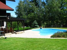 U objektu: oplocená zahrada, zapuštěný bazén 10 x 4 x 2,5 m, krytá terasa s posezením, trampolína, krb, ohniště, posezení, parkování.