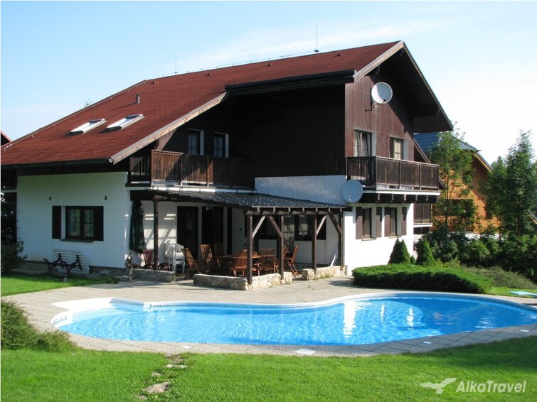 LIPNO: rekreační dům se zapuštěným venkovním bazénem, SAUNOU, VÍŘIVKOU a WiFi, v západní části přehrady Lipno, 600 m od vodní nádrže Lipno, 8 km od Horní Plané na Šumavě a 35 km od Českého Krumlova.