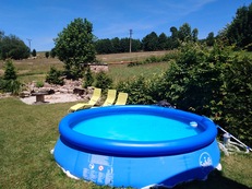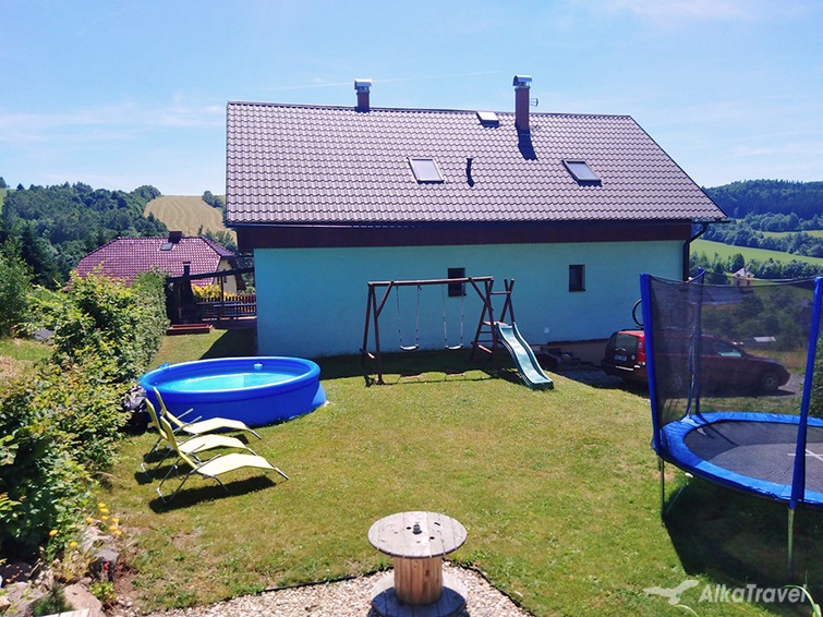 U objektu hezký výhled do údolí, neoplocená zahrada, gril, zastřešené venkovní posezení, udírna, bazén (průměr 3,6 m), parkování, dětská skluzavka, pískoviště, houpačka.