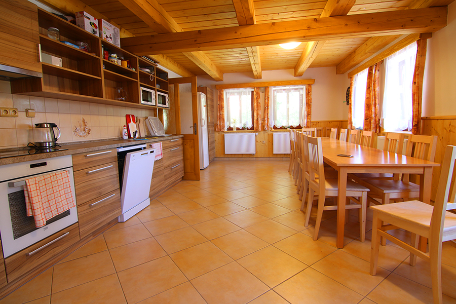 V objektu v přízemí: společenská místnost (TV, WIFI, krbová kamna, rádio, DVD přehrávač, stolní tenis, lednička, myčka), kuchyně (el. sporák, horkovzdušná trouba, lednice + mrazák, 2x mikrovlnná trouba, toustovač, gril, pračka) s jídelním koutem (3x stůl, 24x židle), 1/4 ložnice (1x dvoulůžko, 2x samostatná postel), samostatné WC, koupelna (sprchový kout, umyvadlo, WC, infrasauna pro 4 osoby), chodba se schody do patra.
