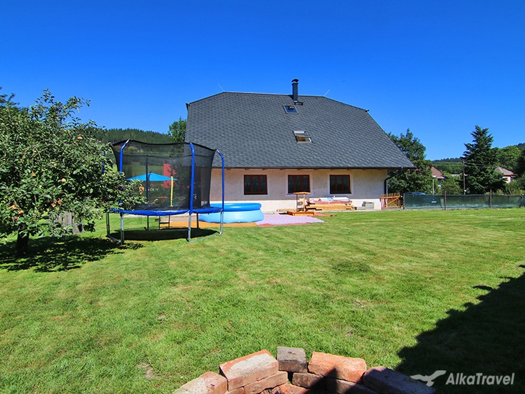 U objektu: oplocená zahrada, zapuštěný vnitřní bazén, stolní fotbálek, elektrické šipky, pískoviště, houpačka, gril, krytá pergola s posezením, kolárna, ohniště, pétanque a líný tenis k zapůjčení, parkování pro max. 7 - 9 aut.