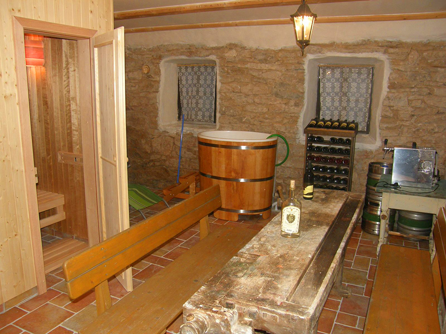 Wellness: sauna a koupací sud. Dále privátní vinotéka a výčep na pivo. Topení: elektrické, tuhá paliva (kachlová kamna).